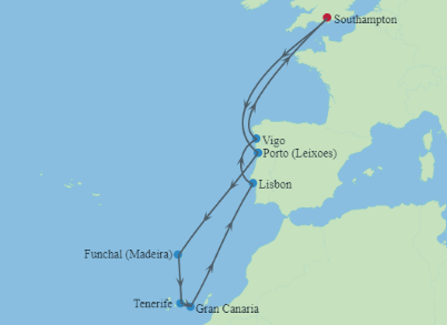Southampton – Porto – Madère – Tenerife – Grande Canarie – Lisbonne – Vigo – Southampton