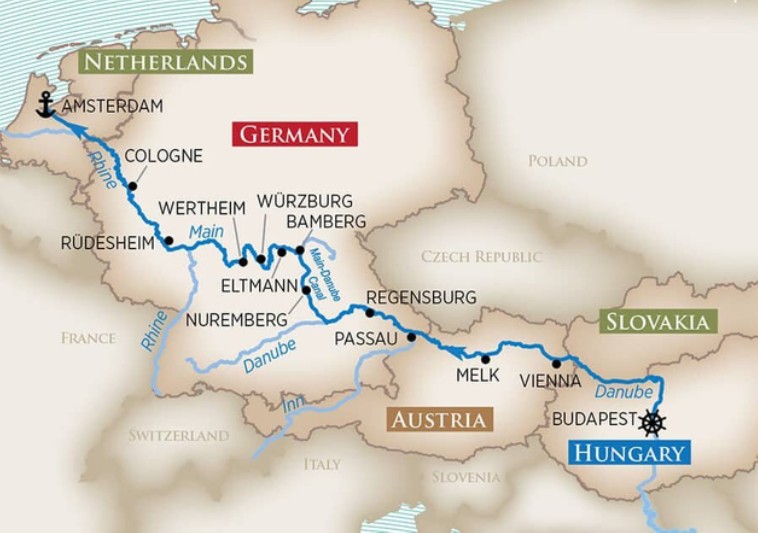 Amsterdam – Cologne – Rüdesheim – Wertheim – Würzburg – Eltmann – Nuremberg – Ratisbonne – Passau – Melk – Vienne – Budapest